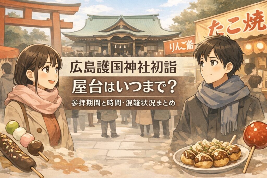 お正月に多くの参拝者で賑わう 広島護国神社。 初詣では参拝だけでなく、境内や周辺に並ぶ屋台グルメを楽しみにしている方も多いのではないでしょうか。この記事では、屋台はいつまで出店しているのかをはじめ、初詣の参拝期間と参拝時間、さらに混雑がピ... -