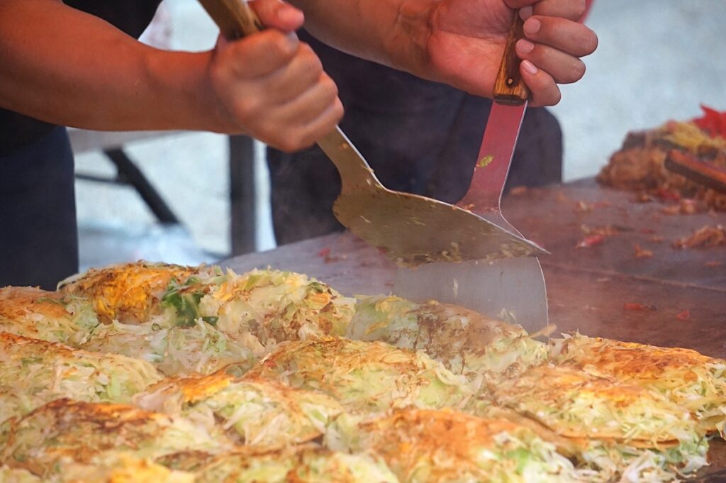 歩行者天国となる通りには、屋台・キッチンカーが100店舗以上立ち並び、地元グルメを中心に香ばしい匂いが広がります。