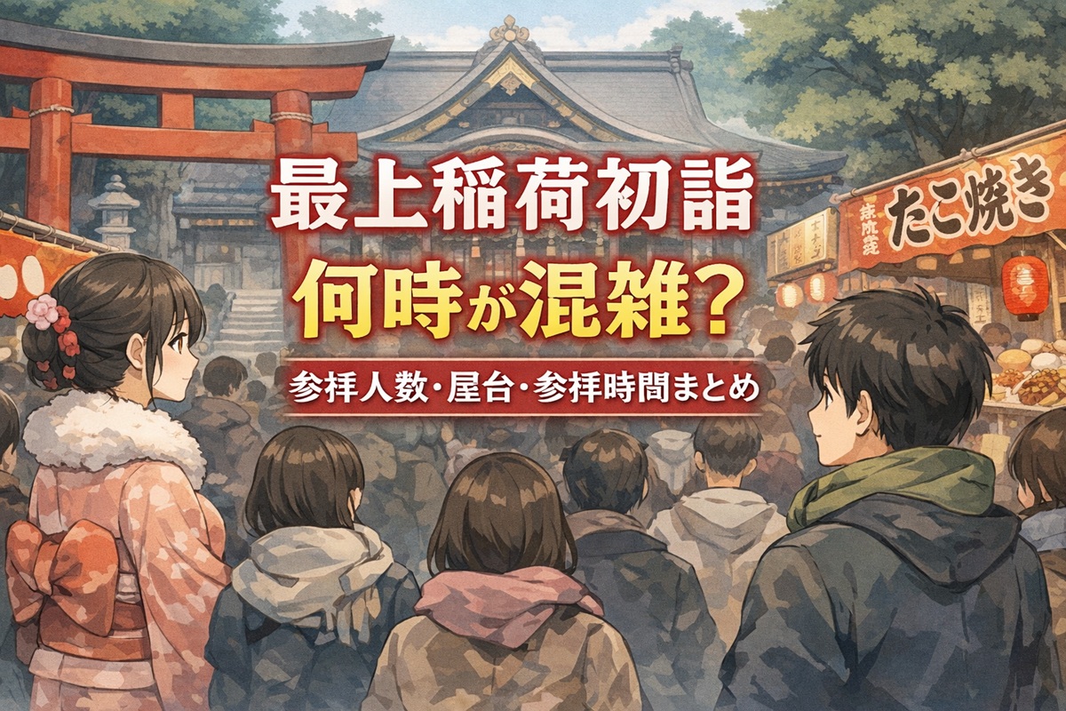 この記事では、最上稲荷初詣の混雑する時間帯を中心に、例年の参拝人数の目安、屋台(出店)の情報、そして参拝時間の詳細までまとめます。