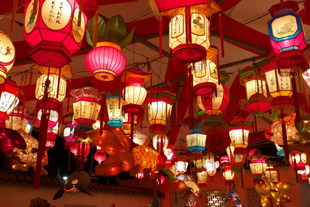 龍や鳳凰、干支モチーフの迫力あるランタンや、写真映え抜群のフォトスポットも多数設置され、夜は街全体が柔らかな灯りに包まれた幻想的な空間になります。