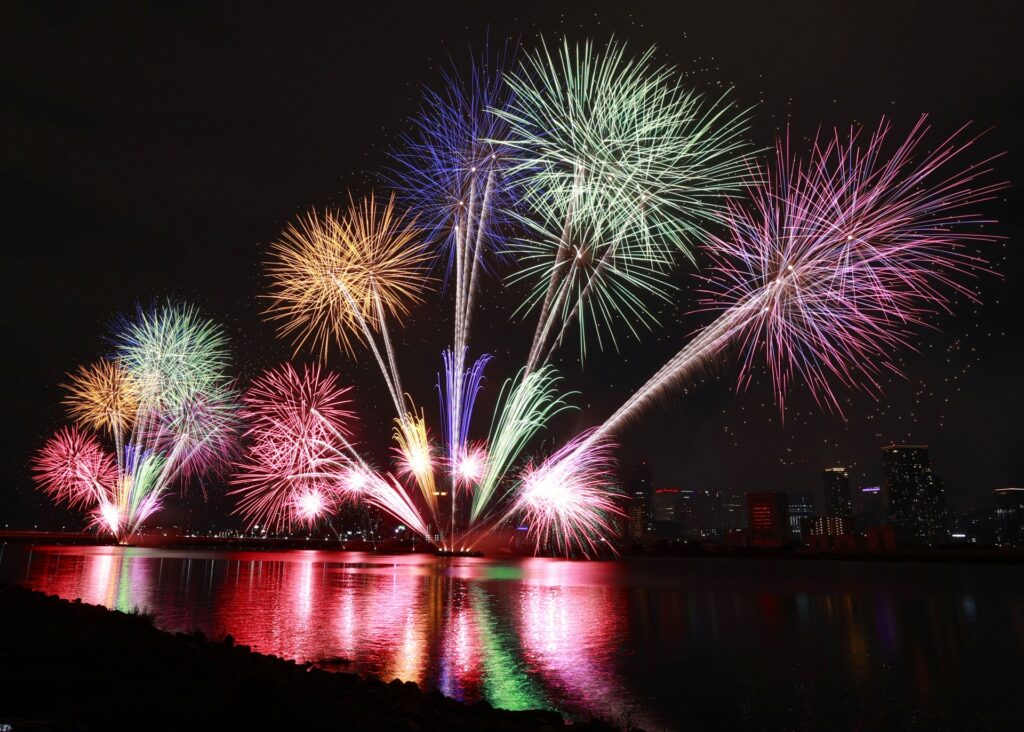 水都・大阪を流れる淀川の河川敷を舞台に、音楽とシンクロする花火やワイドスターマイン、水中花火など多彩な演出が楽しめるのが特徴です。