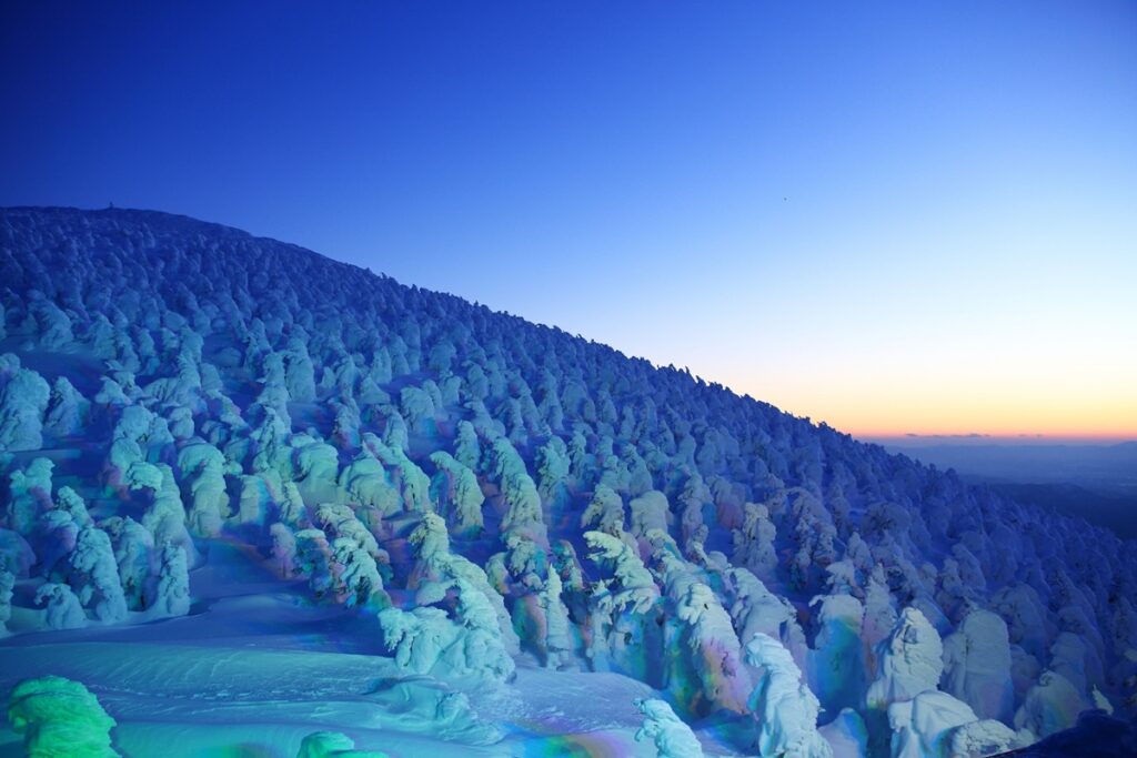 ライトアップ期間中は昼の絶景だけでなく、幻想的な夜の樹氷と温泉街の光が彩る特別な体験ができます。
